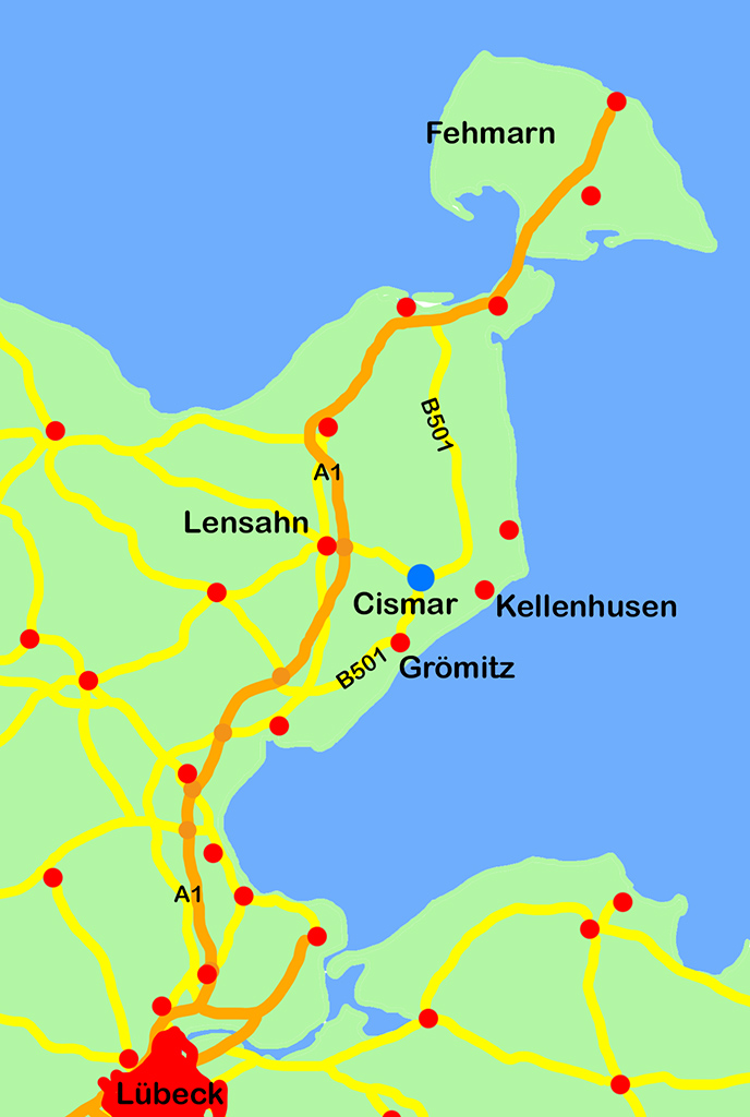 von Lübeck ist eine Autobahnausfahrt nach Cismar (Ausfahrt "Lensahn"), auf der