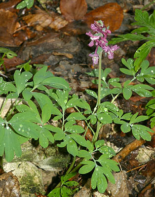 Bei Bad Urach fotografiert. Der Hohle Lerchensporn ist viel auffälliger als der kleinere Mittlere Lerchensporn. Seine Blüten sind rotviolett oder weiß. Er lebt gerne auf Kalkboden in Laubwäldern (im Buchenwald). In Norddeutschland ist er weniger häufig als im Süden. |