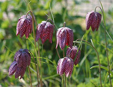 | Schachblume (Kiebitzei) Fritillaria meleagris In der Natur steht die Schachblume streng unter Naturschutz. Sie liebt feuchte Wiesen und blüht dort meist im Mai. Abgebildet ist die normale Form mit dem schwarzroten Schachbrett-Muster, es gibt ziemlich häufig auch weiße Schachblumen. Schachblumen werden recht verbreitet in Gärten angepflanzt.
