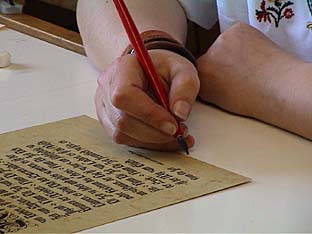 Hannelore Fischer gestaltete seit 1985 handgeschriebene Urkunden oder Sprüche nach Wunsch, beschriftete Titelseiten von Gästebüchern oder gestaltete Widmungen in Buchgeschenken. Auch Blattvergoldungen oder farbig ausgeführte Buchstaben machten ihre Handschriften einzigartig. |